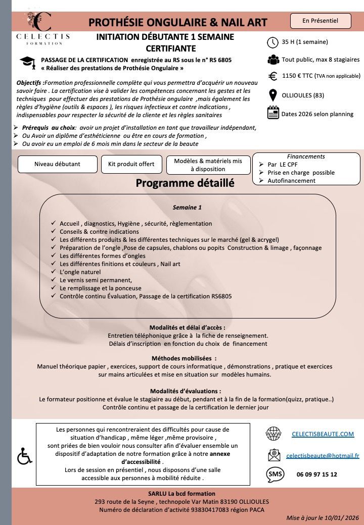 La certification "Pratiquer la prothésie ongulaire" vise à valider les compétences concernant les gestes et les techniques appropriées, les règles d'hygiène relatives aux outils et à l'espace de travail, mais aussi sur les risques infectieux, les contre-indications éventuelles. Ces compétences sont incontournables pour respecter la sécurité du ou de la cliente et les règles sanitaires.